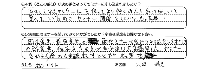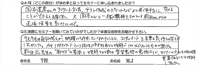 - 岡本達彦先生の『「A4」1枚アンケート広告作成法』をマスターして、広告レスポンスの改善のスペシャリストとして今の仕事に活かしたい。