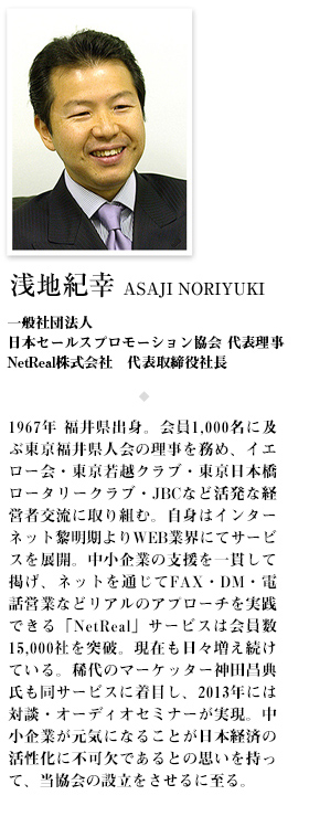 一般社団法人 日本セールスプロモーション協会 代表理事の浅地紀幸です。私は、FAX配信やDM発送などを使って中小企業の販売促進を支援する会社、ネットリアルを経営しています。