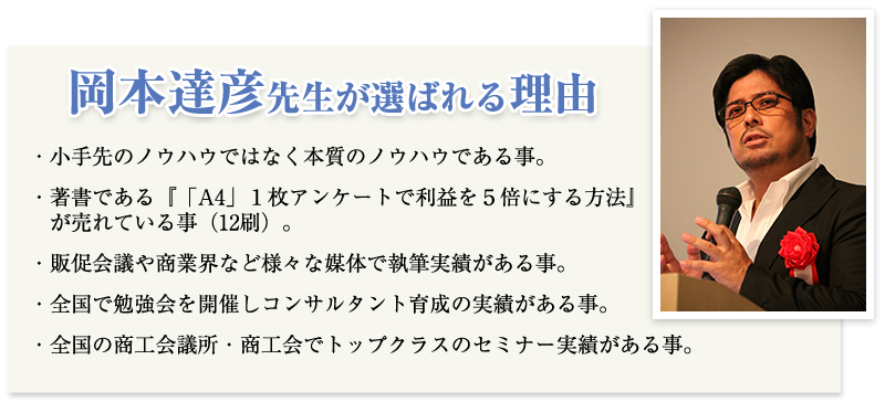 「広告レスポンス改善コンサルタント」認定講座の講師は、広告の反応(レスポンス)を改善するのに最も効果的な手法『「A4」1枚アンケート広告作成法』の考案者である岡本達彦先生。